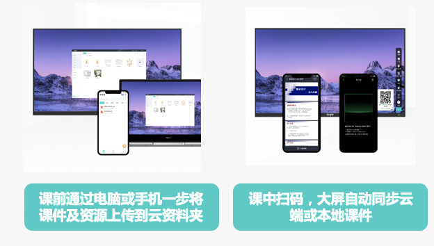 老师使用教学软件UClass,可实现手机、电脑、大屏三端资源随行。手机端、电脑端、大屏端三端资源互通,无需U盘拷课件,老师在课前将资源传到云资料夹,三端可随时调取,上课时通过扫码即可直接将课件投到大屏上,同时还可以用手机对大屏进行操控,课件翻页,告别U盘与翻页笔。